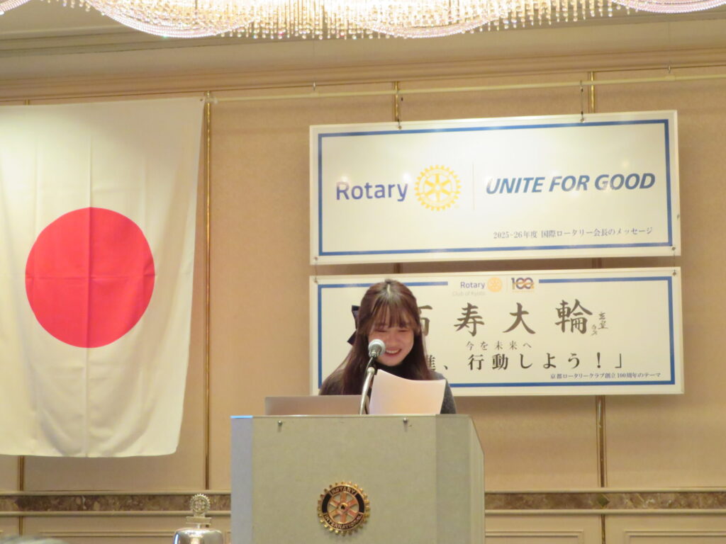 また、京都ロータリークラブ以外のご縁も忘れられません。舞鶴ロータリークラブでは卓話のご縁から登山会に参加し、下山中に一人になった高齢の方を会員が協力して支える姿に、奉仕の精神を強く実感しました。その優しさに触れ、私も将来誰かに手を差し伸べられる人になりたいと心から思いました。