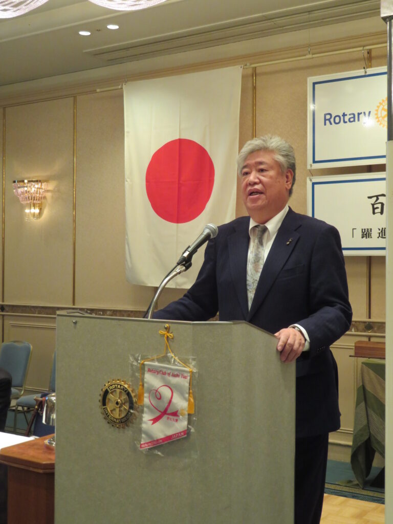 今日は京都で行われた仁孝天皇の即位式を描いた約200年前の絵を持ってきました。讃を右大臣花山院愛徳が書いています。八咫烏(やたがらす)や四神、宣命使(せんみょうし)などが描かれています。 第2650地区の中心は京都ロータリークラブです。(私が所属する)奈良ロータリークラブも常に共にありますので、これからもよろしくお願いします。